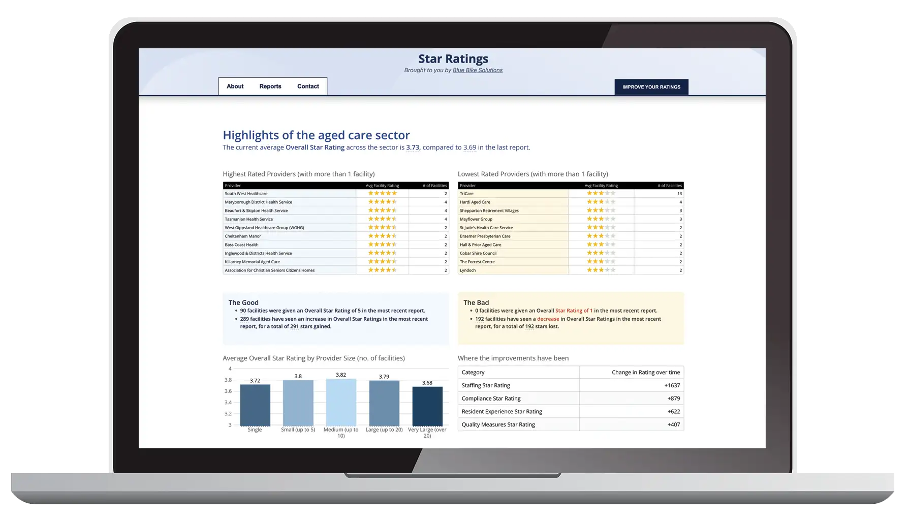 Providers in Australia’s residential aged care sector are assessed across four key domains—Residential Experience, Compliance, Quality Indicators, and Staffing (Care Minutes)—and assigned an Overall Star Rating.